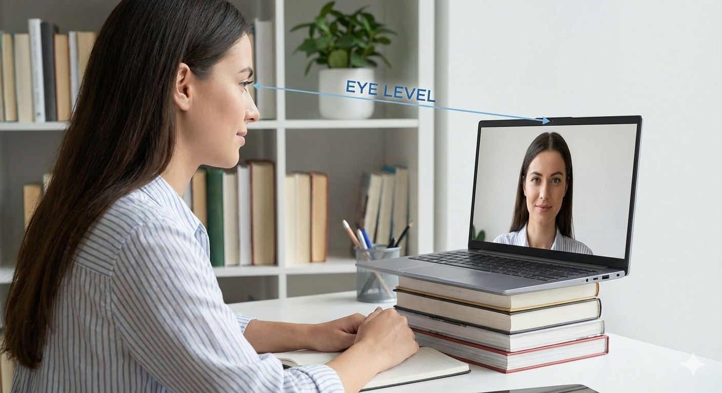 Raise the laptop so you’re looking straight ahead, not up or down. Frame head and shoulders with a small amount of space above the head.